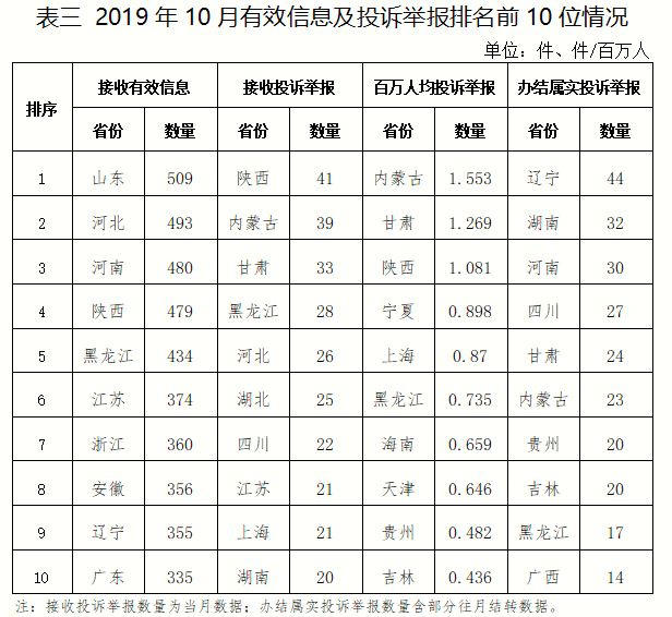 各?。ㄗ灾螀^(qū)、直轄市)按照收到的有效信息數(shù)量排序,山東、河北、河南、陜西、黑龍江等列全國前10位;按照投訴舉報數(shù)量排序,陜西、內(nèi)蒙古、甘肅、黑龍江、河北等排在全國前10位;按照百萬人均投訴舉報數(shù)量排序,內(nèi)蒙古、甘肅、陜西、寧夏、上海等排在全國前10位;按照辦結屬實投訴舉報數(shù)量排序,遼寧、湖南、河南、四川、甘肅等排在全國前10位。(2019年10月有效信息及投訴舉報排名前10位情況見表三)