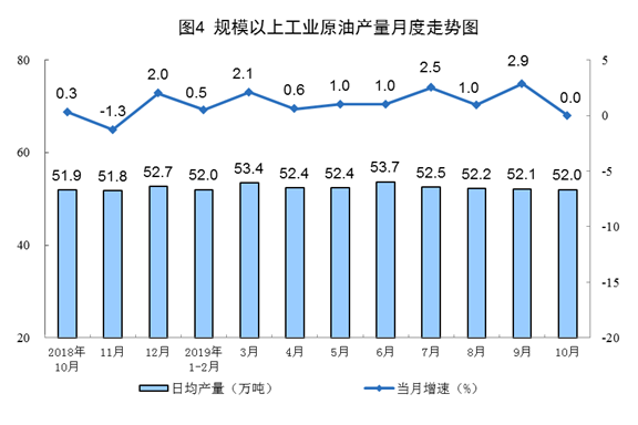 10月份,原油生產(chǎn)1611萬噸,產(chǎn)量與去年同期基本持平;日均產(chǎn)量52.0萬噸,環(huán)比減少0.1萬噸。1—10月份,原油生產(chǎn)15925萬噸,同比增長(zhǎng)1.1%。