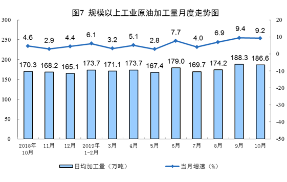 10月份,加工原油5784萬噸,同比增長(zhǎng)9.2%,增速比上月放緩0.2個(gè)百分點(diǎn);日均加工186.6萬噸,環(huán)比減少1.7萬噸。1—10月份,加工原油53710萬噸,同比增長(zhǎng)6.4%。