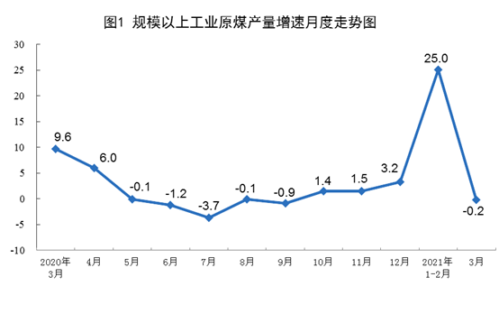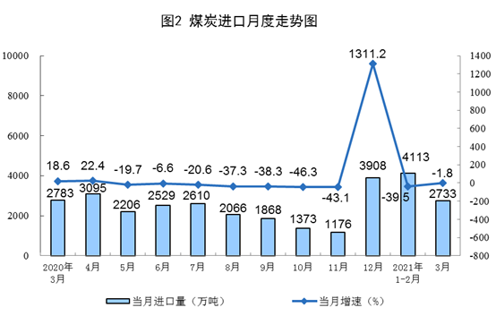 原煤生產(chǎn)小幅下降。3月份,生產(chǎn)原煤3.4億噸,同比下降0.2%,比2019年3月份增長(zhǎng)9.4%,兩年平均增長(zhǎng)4.6%,日均產(chǎn)量1099萬(wàn)噸;進(jìn)口煤炭2733萬(wàn)噸,同比下降1.8%。