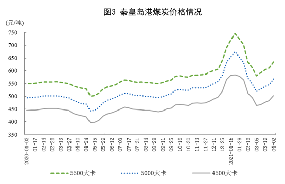 港口煤炭綜合交易價(jià)格有所上漲。4月2日,秦皇島港5500、5000和4500大卡煤炭?jī)r(jià)格分別為每噸634元、567元和502元,比3月5日分別上漲54元、49元和39元。