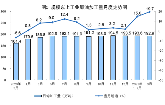 原油生產(chǎn)加快,加工量較快增長(zhǎng)。3月份,生產(chǎn)原油1709萬(wàn)噸,同比增長(zhǎng)3.3%,比2019年3月份增長(zhǎng)3.3%,兩年平均增長(zhǎng)1.6%,日均產(chǎn)量55.1萬(wàn)噸。加工原油5979萬(wàn)噸,同比增長(zhǎng)19.7%,比2019年3月份增長(zhǎng)11.8%,兩年平均增長(zhǎng)5.8%,日均加工192.9萬(wàn)噸。