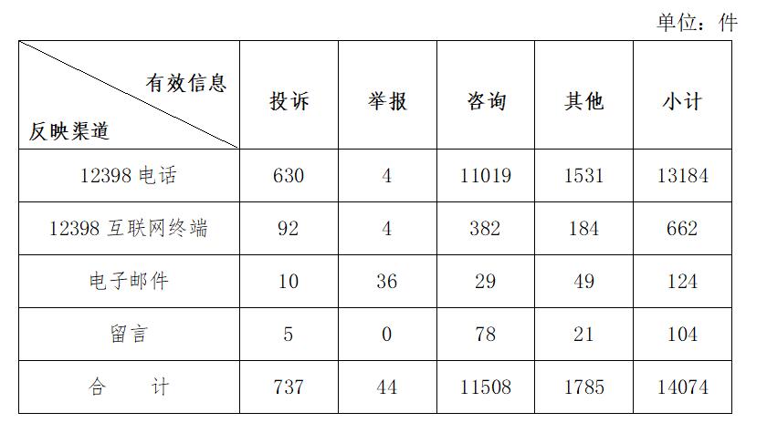 按反映渠道分類(lèi),12398電話13184件,12398互聯(lián)網(wǎng)終端662件,電子郵件124件,留言104件。