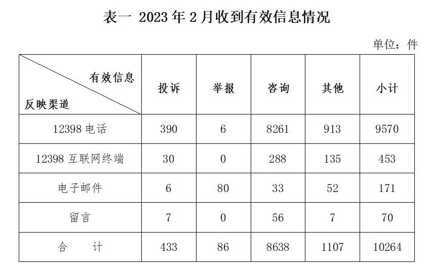 2023年2月,國家能源局12398能源監(jiān)管熱線(以下簡稱12398熱線)共收到有效信息10264件(包含投訴、舉報、咨詢和其他訴求類別),環(huán)比減少27.07%,同比增加22.69%。(2023年2月收到有效信息情況見表一)