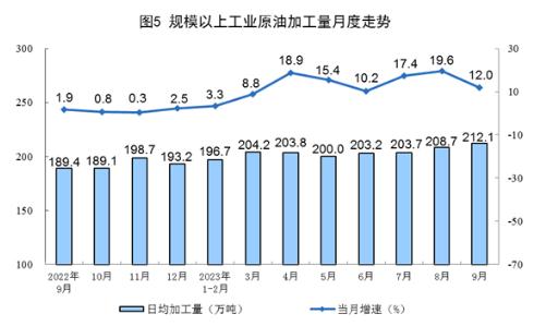 原油加工保持較快增長(zhǎng)。9月份,加工原油6362萬噸,同比增長(zhǎng)12.0%,增速比8月份回落7.6個(gè)百分點(diǎn),日均加工原油212.1萬噸。1—9月份,加工原油55484萬噸,同比增長(zhǎng)11.5%。