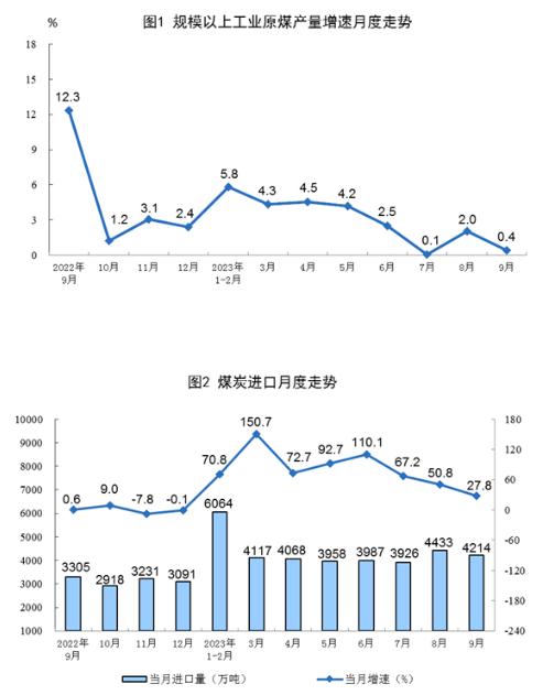 原煤生產(chǎn)保持穩(wěn)定,進(jìn)口快速增長(zhǎng)。9月份,生產(chǎn)原煤3.9億噸,同比增長(zhǎng)0.4%,增速比8月份放緩1.6個(gè)百分點(diǎn),日均產(chǎn)量1310萬噸。進(jìn)口煤炭4214萬噸,同比增長(zhǎng)27.8%,增速比8月份回落23.0個(gè)百分點(diǎn)。