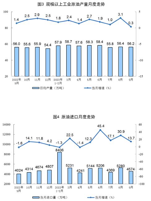 原油生產(chǎn)平穩(wěn)增長(zhǎng),進(jìn)口較快增長(zhǎng)。9月份,生產(chǎn)原油1687萬噸,同比增長(zhǎng)0.3%,增速比8月份放緩2.8個(gè)百分點(diǎn),日均產(chǎn)量56.2萬噸。進(jìn)口原油4574萬噸,同比增長(zhǎng)13.7%,增速比8月份回落17.2個(gè)百分點(diǎn)。