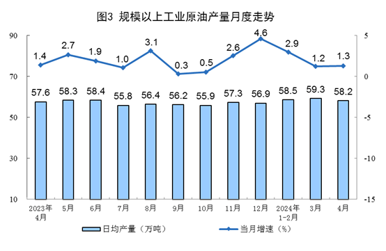原油生產(chǎn)平穩(wěn)增長(zhǎng),進(jìn)口由降轉(zhuǎn)增。4月份,規(guī)上工業(yè)原油產(chǎn)量1747萬噸,同比增長(zhǎng)1.3%,增速比3月份加快0.1個(gè)百分點(diǎn);日均產(chǎn)量58.2萬噸。進(jìn)口原油4472萬噸,同比增長(zhǎng)5.9%。