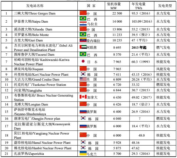 目前全球21席中,中國占有7席:水力發(fā)電占有4席:三峽大壩、溪洛渡大壩、向家壩和龍灘大壩;燃煤發(fā)電占一席:托克托電廠;核能發(fā)電占一席:陽江核電站;風(fēng)電場占一席:酒泉風(fēng)電場。