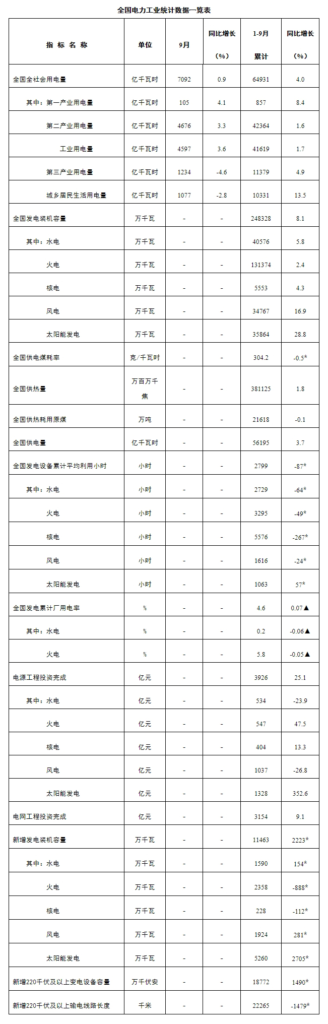 10月24日,國家能源局發(fā)布1-9月份全國電力工業(yè)統(tǒng)計數(shù)據(jù)。