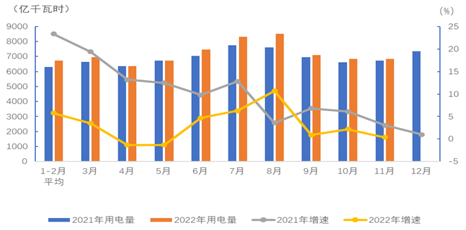 圖1 2021、2022年分月全社會用電量及其增速