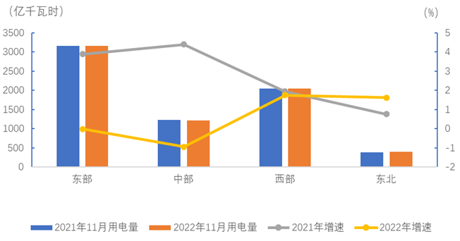 11月份,東、中、西部和東北地區(qū)全社會用電量增速分別為-0.02%、-0.9%、1.8%和1.6%。
