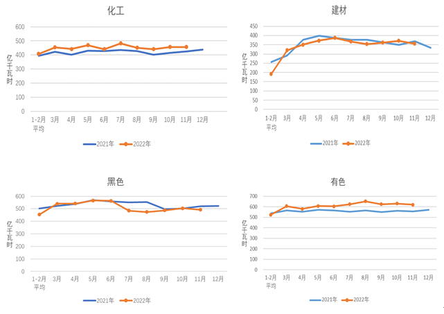 1-11月,化工行業(yè)用電量4977億千瓦時,同比增長5.1%;建材行業(yè)用電量3688億千瓦時,同比下降3.3%;黑色金屬冶煉行業(yè)用電量5580億千瓦時,同比下降5.0%;有色金屬冶煉行業(yè)用電量6796億千瓦時,同比增長3.0%。