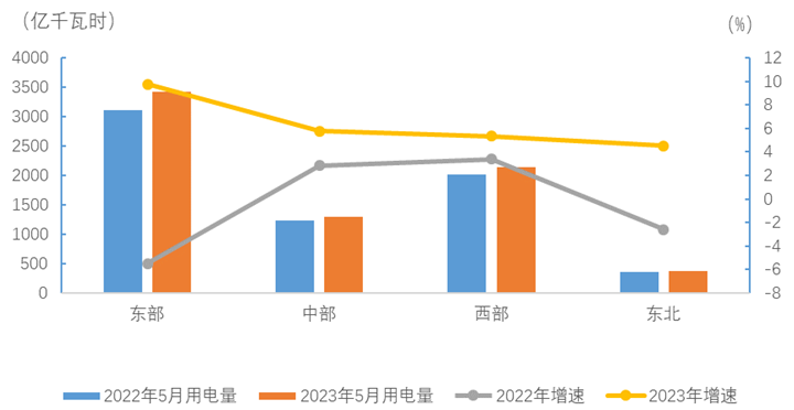 5月份,東、中、西部和東北地區(qū)全社會用電量增速分別為9.7%、5.8%、5.3%和4.5%。
