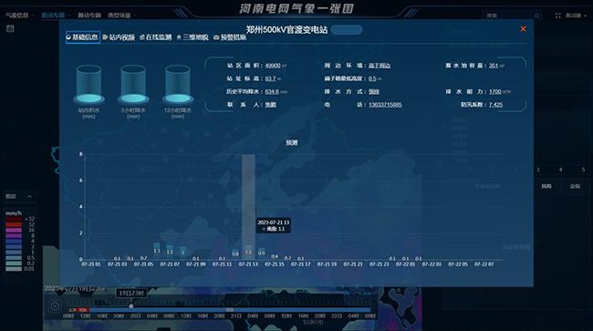 “一張圖”建設以電網氣象災害風險預報預警模型為核心,集夏季防汛、冬季覆冰舞動、春秋季風災等多種電網氣象災害風險預報預警于一體,預警信息的地理精度可具體到變電站、線路桿塔。通過平臺可實時捕捉電網設備的氣象要素監(jiān)測和預報信息,以及變電站周邊環(huán)境監(jiān)控等。當出現重大天氣過程時,平臺根據不同風險等級預測,動態(tài)提供“一站一策式”的24小時、72小時內應對措施建議。