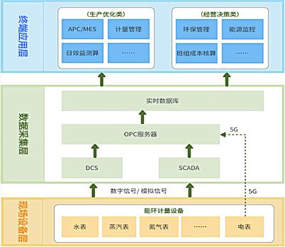 該體系主要由現(xiàn)場設(shè)備層、數(shù)據(jù)采集層、終端應(yīng)用層等組成。他們根據(jù)工藝與計量要求,先后配備了帶信號遠(yuǎn)傳功能、高準(zhǔn)確度等級的質(zhì)量流量計、電磁流量計、超聲波流量計等智能型計量儀表,實現(xiàn)一、二級能源計量表配備率達(dá)100%。通過計量儀表傳輸端采集能源計量數(shù)據(jù),上傳至DCS或SCADA系統(tǒng),再通過OPC接口上傳至實時數(shù)據(jù)庫,采用5G無線傳輸技術(shù)解決偏遠(yuǎn)區(qū)域計量儀表信號的數(shù)據(jù)采集與傳輸,最終為終端系統(tǒng)提供有效數(shù)據(jù)支持。