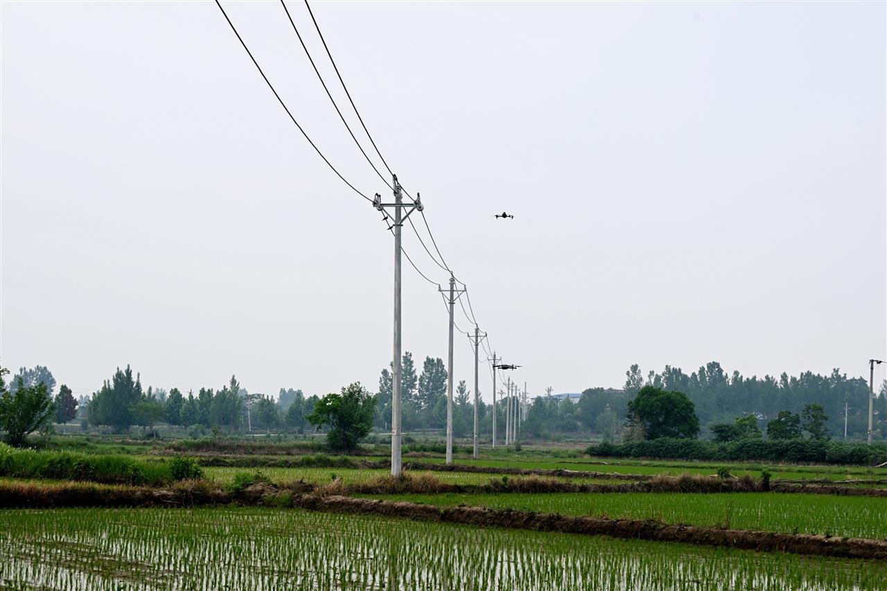 在湖北省安陸市木梓鎮(zhèn)10千伏江河線驗收現(xiàn)場,國網湖北電力利用無人機AI技術自主驗收配電架空線路(余健兵、何瑤 攝)