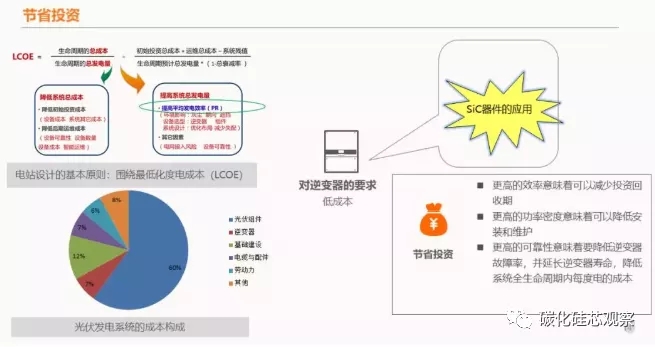 實際上,在光伏發(fā)電的系統(tǒng)當(dāng)中,硅基的逆變器的成本占到系統(tǒng)的10%左右,但它卻是系統(tǒng)損耗的一個主要來源。如果通過使用碳化硅功率模塊的光伏逆變器,系統(tǒng)的轉(zhuǎn)化效率可以從96%提升到99%以上,能量損耗能夠降低50%以上,能夠顯著的提高循環(huán)設(shè)備的使用壽命,能夠降低系統(tǒng)的體積,增加功率密度,從而降低生產(chǎn)成本。