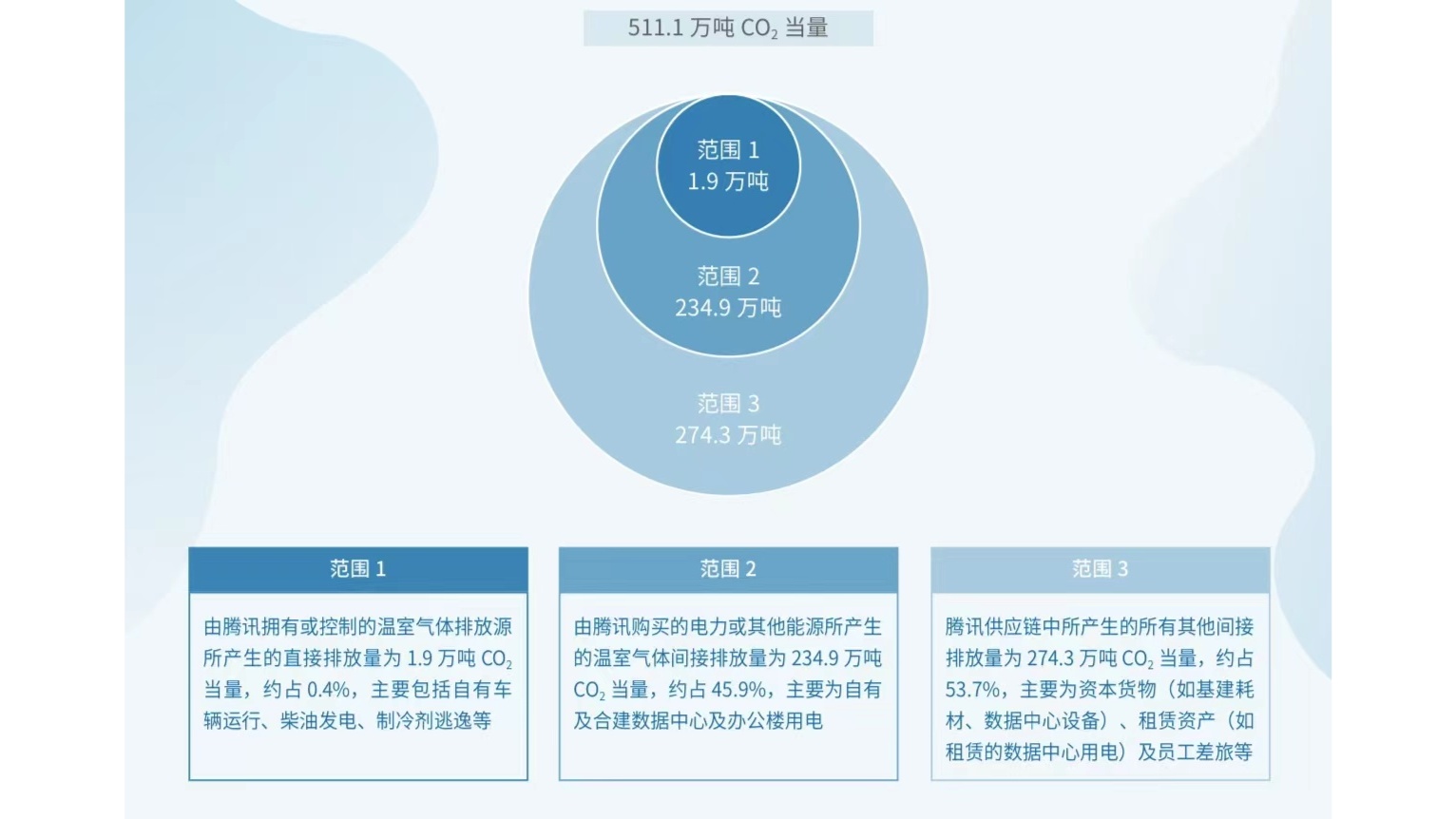 2021年,騰訊溫室氣體排放量總計511.1萬噸。其中,公司擁有或控制的溫室氣體排放源所產(chǎn)生的直接排放量(即“范圍1”)、購買的電力或其他能源所產(chǎn)生的間接排放量(即“范圍2”)分別為1.9萬噸和234.9萬噸;供應(yīng)鏈上下游產(chǎn)生的其他間接排放量(即“范圍3”)為274.3萬噸。該結(jié)果是騰訊基于國際通行的碳減排范圍標(biāo)準(zhǔn)進(jìn)行的系統(tǒng)全面的碳盤查。