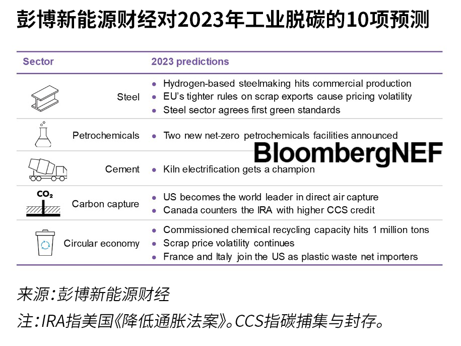 長(zhǎng)期以來(lái)被認(rèn)為難以減排的工業(yè)部門(mén)正在以比預(yù)期更快的速度脫碳。歐洲已經(jīng)開(kāi)始綠鋼試點(diǎn)生產(chǎn),水泥廠正在宣布全面的碳捕集裝置,加拿大和法國(guó)正在建造凈零石化綜合設(shè)施。2023年還會(huì)有更多此類行動(dòng)。