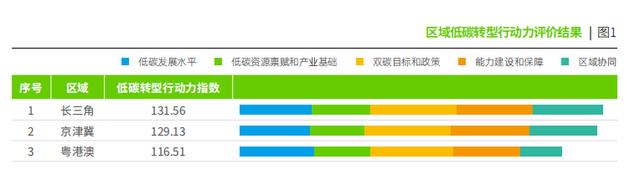 “長三角的低碳轉(zhuǎn)型行動力指數(shù)最高;京津冀在“雙碳”目標(biāo)和政策及能力建設(shè)和保障方面表現(xiàn)最突出;粵港澳則在低碳發(fā)展水平方面最具優(yōu)勢。”