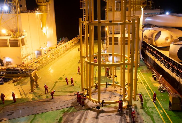 8月4日,搭載著全球已下線的最長(zhǎng)126米風(fēng)電葉片的“遠(yuǎn)瑞169”輪成功抵靠山東港口煙臺(tái)港蓬萊港公司泊位,在兩臺(tái)門機(jī)的高效配合下,該海上“巨無(wú)霸”僅用25分鐘便成功起吊下船,再次打破山東港口最長(zhǎng)風(fēng)電葉片吊裝紀(jì)錄,持續(xù)擦亮“中國(guó)北方知名風(fēng)電設(shè)備作業(yè)母港”稱號(hào)。