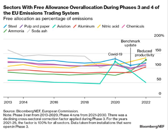 自歐盟ETS于2005年建立以來,除電力行業(yè)外,幾乎一半的履約實體都獲得了超過其100%總排放量的配額。這些過剩的配額可以賣回給市場,根據(jù)2022年81歐元/噸的平均碳價計算,相當于價值220億歐元(合240億美元)的潛在收入,或者保留下來以備將來使用,從而推遲了脫碳需要。彭博新能源財經(jīng)估計,如果鋼鐵、鋁和水泥行業(yè)在2028年出售其所有的超額分配,收入最高可達290億歐元。