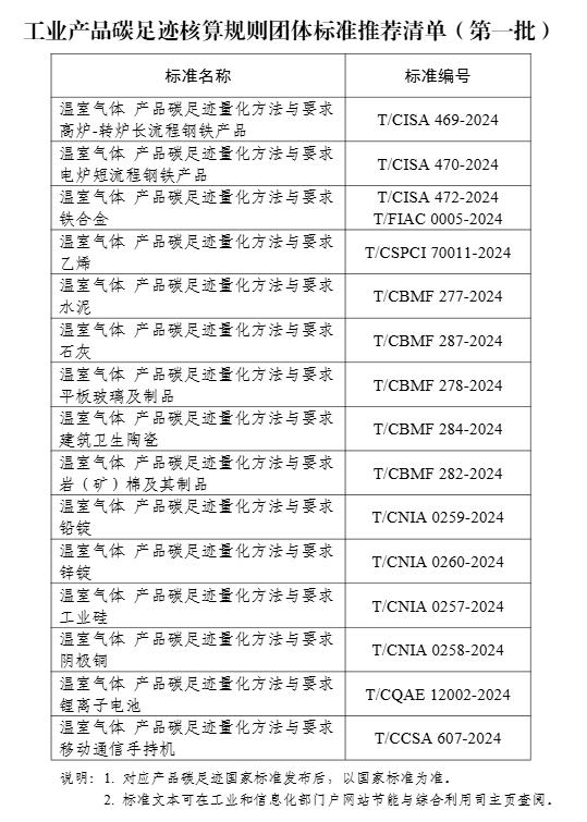 為加快提升工業(yè)產(chǎn)品碳足跡管理水平,建立健全碳足跡管理體系,促進(jìn)工業(yè)綠色低碳轉(zhuǎn)型,經(jīng)相關(guān)標(biāo)準(zhǔn)化機構(gòu)推薦、專家評審、網(wǎng)上公示等程序,工業(yè)和信息化部、生態(tài)環(huán)境部、國家發(fā)展改革委、市場監(jiān)管總局確定了15項工業(yè)產(chǎn)品碳足跡核算規(guī)則團(tuán)體標(biāo)準(zhǔn)推薦清單(第一批),現(xiàn)予以公布。