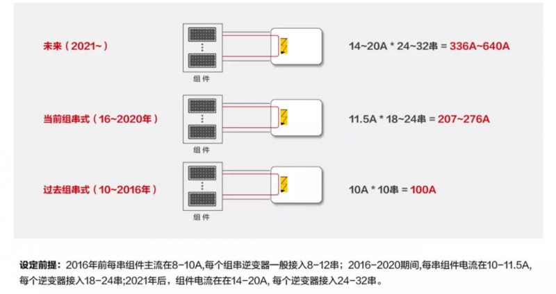 隨著硅片尺寸越來越大以及電池效率越來越高,組件電流不斷提高成為必然趨勢。我們看到,組件電流越來越大,逆變器功率或匯流箱對應(yīng)的組串數(shù)量也不斷增加。
