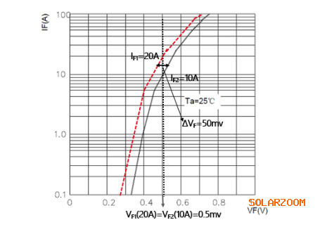 《無法忽視的真相》一文中,作者以二極管正向耐壓曲線來杜撰所謂的并聯(lián)二極管分流特性圖,文中錯誤地標識圖表,有意夸大事實、混淆視聽。比如,該圖中列出VF1(20A)= VF2(10A)=0.5mV,而實際上曲線中的數(shù)據(jù)點指向了0.5V,兩者相差1000倍,這種數(shù)據(jù)如何讓人信服?而在幾天之后的另外一篇文章《一圖看懂超大組件接線盒的安全風險》中,該文作者又悄然將這部分的內(nèi)容刪除,這是典型的信心缺失。