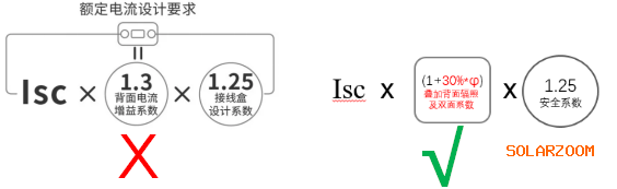 2021年2月,IEC61215/IEC61730:2021已發(fā)布,標準中增加了雙面組件的相關(guān)定義和描述。該標準推薦按照1.25xIsc-BSI 進行零部件選型,請注意這里需要考慮雙面組件的雙面系數(shù)φ(目前,普遍的雙面系數(shù)φ約為70%)。根據(jù)歷次標準升級慣例,考慮到認證機構(gòu)及實驗室設(shè)備升級、資質(zhì)認可,2021版標準的正式執(zhí)行還需數(shù)月至數(shù)年時間。然而,《無法忽視的真相》一文,生搬硬套錯誤的標準并缺乏深度理解,這是完全不了解產(chǎn)品和標準的表現(xiàn)。