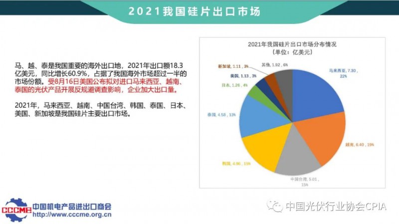 中國機電產(chǎn)品進出口商會光伏分會秘書長張森介紹光伏產(chǎn)品國際貿(mào)易情況。2021年我國光伏產(chǎn)業(yè)規(guī)模、對外貿(mào)易量持續(xù)擴大,行業(yè)發(fā)展主要痛點是光伏貿(mào)易摩擦再次升級、海運費和匯率大幅上漲等。