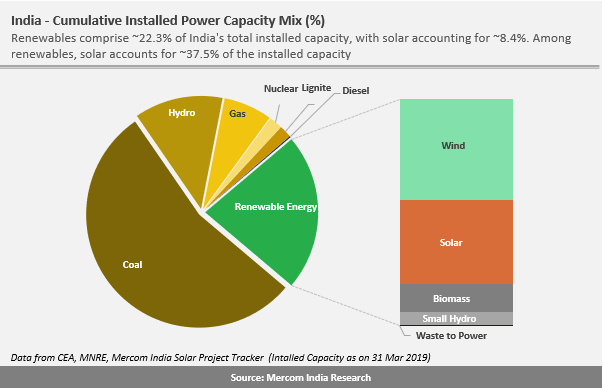 印度的可再生能源產(chǎn)能繼續(xù)增加,占2018 -19年財政年度末(FY)總裝機容量的比例約22.3%。這比上一財年的20.3%有所增加。這一顯著增長主要歸因于太陽能裝機容量的增長。