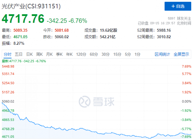 9月15日,受歐盟委員會(huì)擬推行“涉J法案”等利空消息影響,光伏板塊全線暴跌,中證光伏產(chǎn)業(yè)指數(shù)(CSI:931151)報(bào)收4718點(diǎn),跌幅達(dá)到6.67%,自8月18日高點(diǎn)以來,累計(jì)跌幅達(dá)到18.6%。