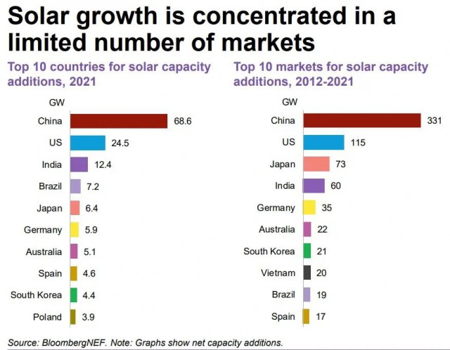 根據(jù)BNEF的數(shù)據(jù),市場(chǎng)領(lǐng)導(dǎo)者中國(guó)2021年開(kāi)發(fā)了68.6GW太陽(yáng)能,其次是美國(guó)的24.5GW和印度的12.4GW。