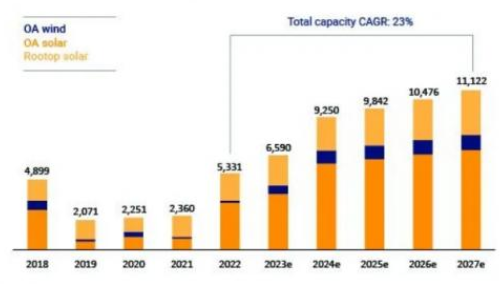 印度的基本關(guān)稅(BCD)進(jìn)口稅以及型號和制造商批準(zhǔn)名單(ALMM)計劃在繼續(xù)限制供應(yīng),因此,印度最近一直在經(jīng)歷組件供應(yīng)短缺問題。鑒于此,報告認(rèn)為,在今年剩下的時間里,增速將會放緩,但2024年及之后的數(shù)字將開始更快的增長。預(yù)計2023年,企業(yè)可再生能源容量將增加6.5GW,而2024年將超過9GW。