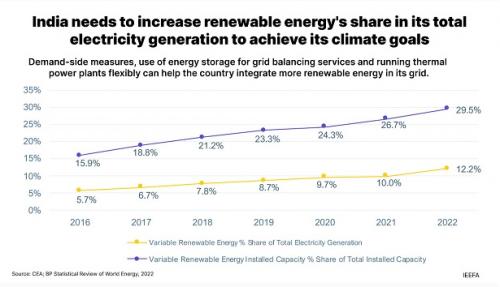 該報告聲稱,在2016年至2022年期間,印度安裝的可再生能源發(fā)電設(shè)施裝機(jī)容量在其印度總能源結(jié)構(gòu)中的份額僅增長了6.5%。但同期可再生能源發(fā)電量的份額增長了13.6%。印度正在迅速開發(fā)可再生能源,其速度快于化石燃料發(fā)電設(shè)施,但需要開發(fā)更多的可再生能源以實(shí)現(xiàn)其氣候目標(biāo)。