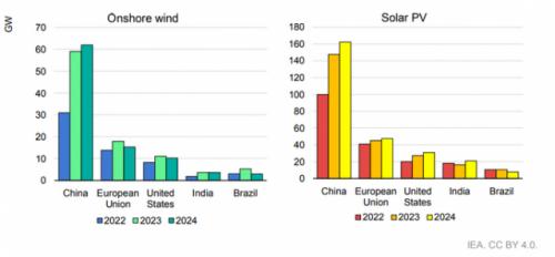 光伏組件價格的下降、分布式光伏系統(tǒng)的更多采用以及大規(guī)模部署的政策推動,推動了包括中國、歐盟、美國和印度在內(nèi)的所有主要光伏市場的增長。相比之下,如果不迅速實施激勵政策,預(yù)計2024年全球陸上風(fēng)力發(fā)電新增裝機容量將比2023年下降約5%。