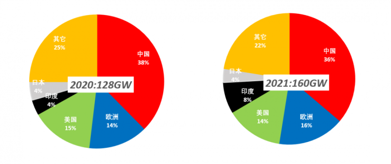 2021年光伏裝機(jī)量的增長(zhǎng)主要來源于幾大傳統(tǒng)太陽能市場(chǎng):中國(guó)/美國(guó)/歐洲/印度
