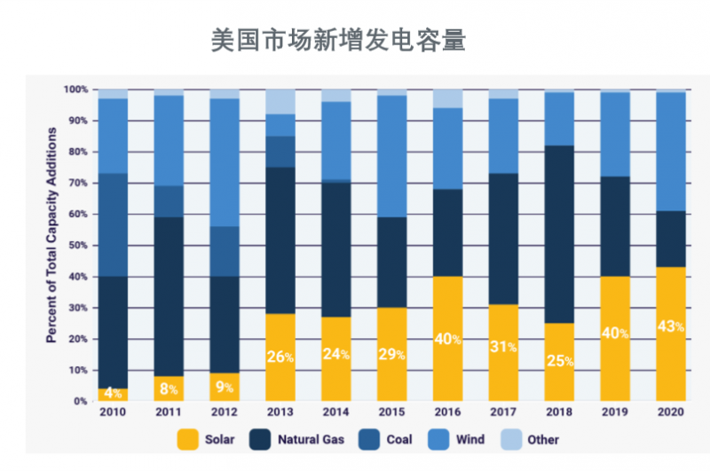 2020年,美國(guó)太陽能新增裝機(jī)較2019年增長(zhǎng)了43%,裝機(jī)量達(dá)到了19.2GW,突破了歷史記錄