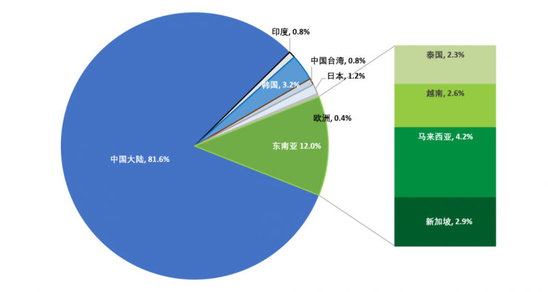 2021年2月,中國(guó)大陸市場(chǎng)的太陽能電池片產(chǎn)量占比穩(wěn)定,仍然保持在80%以上