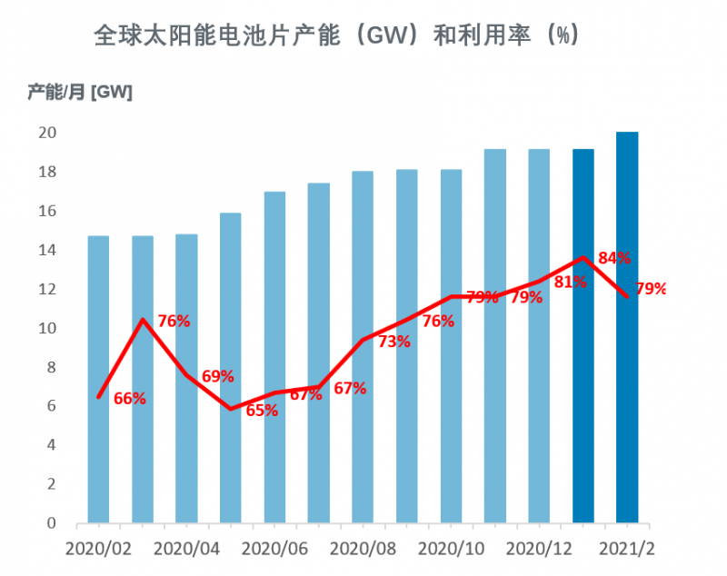 2021年2月,由于中國(guó)市場(chǎng)經(jīng)歷了春節(jié)假期,全球及中國(guó)大陸地區(qū)電池片產(chǎn)能利用率下降至79%