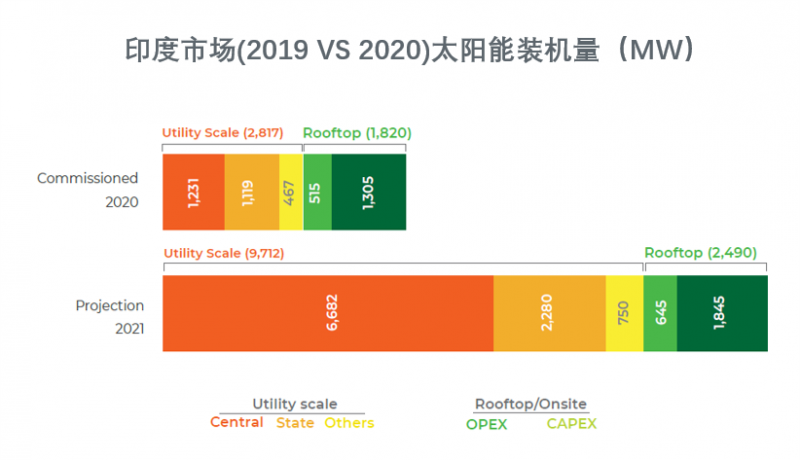 2021,印度市場(chǎng)預(yù)計(jì)將投產(chǎn)約9.7GW的新公用事業(yè)規(guī)模太陽能項(xiàng)目和2.5GW的屋頂/現(xiàn)場(chǎng)太陽能項(xiàng)目