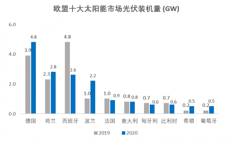 德國(guó)依然是歐洲最大的太陽能裝機(jī)市場(chǎng),2020年的光伏裝機(jī)量達(dá)到了4.8GW,而西班牙的光伏裝機(jī)量則由于新冠疫情下的封城影響呈現(xiàn)了大幅下降狀態(tài)