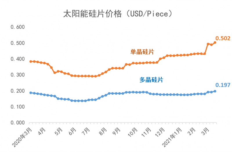 從2021年年初開始,多晶硅短缺的狀況持續(xù)加劇。2021年3月,歷經(jīng)了傳統(tǒng)的春節(jié)假期之后,上游多晶硅環(huán)節(jié)更加供不應(yīng)求,目前的價(jià)格相比于2021年1月6日的價(jià)格已上漲了41%;同時(shí),由于上游多晶用料呈現(xiàn)價(jià)格上漲,硅片端的價(jià)格同時(shí)跳漲。