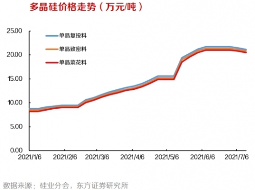 或許是在大擴產(chǎn)的預期下,近期硅料普遍價格由大漲轉向松動。根據(jù)硅業(yè)分會數(shù)據(jù),上周國內單晶復投料成交均價下滑至 20.81 萬元/噸,周環(huán)比降幅為 1.61%;單晶致密料成交均價下滑至 20.6 萬元/噸,周環(huán)比降幅為 1.06%;單晶菜花料成交均價下滑至 20.35 萬元/噸,周環(huán)比降幅 0.73%。