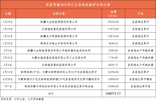 與此同時,國內多晶硅還原爐市占率第一、該細分領域絕對龍頭的雙良節(jié)能也受益頗豐(還原爐是生產(chǎn)多晶硅的重要設備),近三年來累計為行業(yè)各家硅料企業(yè)提供三百多臺大型高效還原爐。據(jù)公告統(tǒng)計,2021年以來公司已簽訂的多晶硅還原爐項目已高達15.02億元,相比2020全年多晶硅還原爐系統(tǒng)實現(xiàn)的1.77億元收入,大幅增長748.59%。