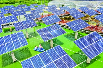 近年來(lái),廣西壯族自治區(qū)蒙山縣因地制宜開(kāi)展“光伏+漁業(yè)”的光伏發(fā)電項(xiàng)目,將原先一些洼澇地、荒地打造為“漁光互補(bǔ)”光伏電站,改變傳統(tǒng)的漁業(yè)養(yǎng)殖生產(chǎn)方式,實(shí)施農(nóng)光互補(bǔ),既符合國(guó)家清潔低碳能源發(fā)展戰(zhàn)略,又為該縣鄉(xiāng)村振興增添新力量。圖為8月17日,工人在“漁光互補(bǔ)”村級(jí)光伏電站喂養(yǎng)魚(yú)蝦。何華文攝/光明圖片