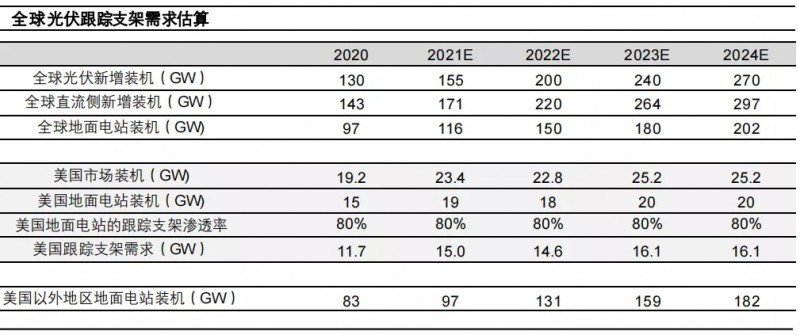 隨著跟蹤支架持續(xù)技術(shù)迭代,其經(jīng)濟(jì)性和可靠性等方面的性能持續(xù)提升,相對(duì)固定支架的優(yōu)勢(shì)有望進(jìn)一步凸顯,從而推動(dòng)跟蹤支架滲透率的提升。我們估算,未來(lái)3年內(nèi),全球跟蹤支架需求有望達(dá)到34%,美國(guó)以外地區(qū)的跟蹤支架需求的復(fù)合增速有望達(dá)到45%。