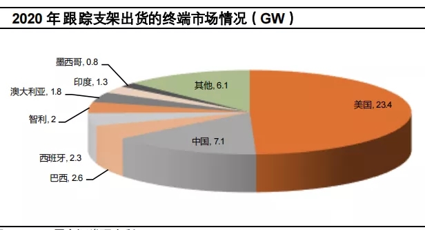 近年,隨著光伏需求的增長(zhǎng)以及跟蹤支架性價(jià)比的提升,全球跟蹤支架出貨量呈現(xiàn)快速增長(zhǎng)。據(jù)彭博新能源統(tǒng)計(jì),2020年度全球跟蹤支架出貨 47.5GW,其中美國(guó)市場(chǎng)需求23.4GW,占比約50%。此外,拉丁美洲、西班牙、澳大利亞、印度、中東等光照條件比較好的地區(qū)的跟蹤支架需求也很可觀。